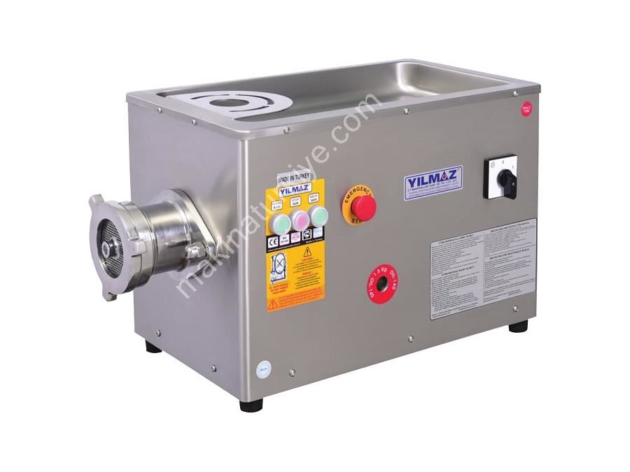 600 Kg 32 No 100 Mm Et Kıyma Makinası Ürün Avantajları; Hijyen ve insan sağlığı düşünülerek ilk defa firmamız tarafından CE standartlarına uyum sağlayacak şekilde dizayn edilmiştir. Makinada 3 Kw 4 Hp Trifaze motor bulunmaktadır. Kapasite ; 4,5 mm ayna ile kullanıldığında 600 kg/saat’tir. Makinada motor koruyucu olarak 2 (iki) adet kontaktör kullanılmaktadır. Şanzuman gövdesi alüminyum dökümdür. Şanzuman ön kapağı, keçe yatağının oksitlenip çürümemesi için pik dökümden yapılmıştır. Makinada et işleme birimlerinin tüm bağlantı ekipmanlarında 304 kalite paslanmaz çelik kullanılmaktadır. Üst tepsisi ( et yükleme haznesi ) ve kasasında 304 kalite paslanmaz çelik sac kullanılmıştır. Üst tepsi alt yüzeyine ısı önleyici izolasyon uygulanmıştır. Üst tepsi kenarları bakteri tutmaması için oval olarak tasarlanmıştır. Üst tepsisinde 3 mm kalınlığında 304 kalite paslanmaz çelikten yapılmış el koruma aparatı bulunmaktadır. Kovan (et çıkış haznesi),helezon (burgu veya top),bilezik (somun) ve et giriş boğazı 304 kalite paslanmaz çelik dökümdür. Et çıkış haznesinin sökülüp takılabilmesi için 2 adet M16 paslanmaz cıvata 2 adet M16 paslanmaz somun kullanılmaktadır. Dışarıdan toz-kir vb. gelmesini engellemek için ön yüzeyi kapalı şapkalı somun kullanılmaktadır. Et çıkış haznesi (kovan) temizlik ve hijyen açısından kolayca sökülüp takılabilmektedir. Bileziği ( somunu ) ve et çıkış haznesini söküp takmak için paslanmaz çelik anahtar bulunmaktadır. Kolay taşınabilmesi için arka kapakta taşıma kolu bulunmaktadır. İleri-geri-stop butonları ve acil durumlar için acil stop butonu mevcuttur. Paslanmaz ayna ve bıçak kullanılmaktadır. Makinanın alt yüzeyinde, istenmeyen haşerelerin girmesini engellemek için koruyucu muhafaza teli bulunmaktadır. Makinada yağ ve aleve dayanıklı elektrik bağlantı kablosu bulunmaktadır.