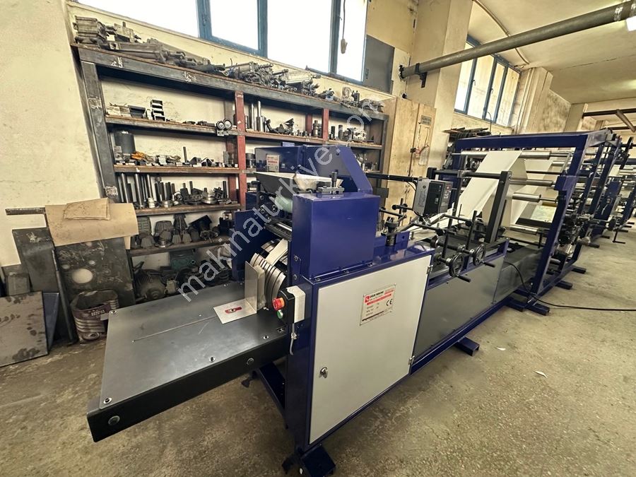 1,2,3 Renk Dipsiz Körüklü Kese Kağıdı Makinesi Kese kağıdı üretiminde hız, kalite ve esneklik sağlayan 1, 2, 3 Renk Dipsiz Körüklü Kese Kese Kağıdı Makinesi, farklı renklerde baskı yapabilme özelliği ve hassas üretim kapasitesiyle endüstriyel kullanıma uygun bir çözümdür. Özellikle gıda, perakende ve ambalaj sektöründe yaygın olarak kullanılan kese kağıtlarının seri üretimini mümkün kılar. Öne Çıkan Özellikler: 1, 2 veya 3 Renk Baskı Seçeneği: Kese kağıtlarına tek renk, çift renk veya üç renk baskı yapabilme imkanı sunar. Kullanım Alanları: Gıda Sektörü: Fırın, pastane ve restoranlarda kullanılan kese kağıtlarının üretimi Perakende ve Marketler: Market poşeti yerine kullanılan çevre dostu kese kağıtlarının üretimi Ambalaj Sanayi: Ürünlerin hijyenik ve pratik şekilde paketlenmesi için ideal çözüm Promosyon ve Marka Tanıtımı: Özel baskılı kese kağıtları ile marka bilinirliğini artırma imkanı