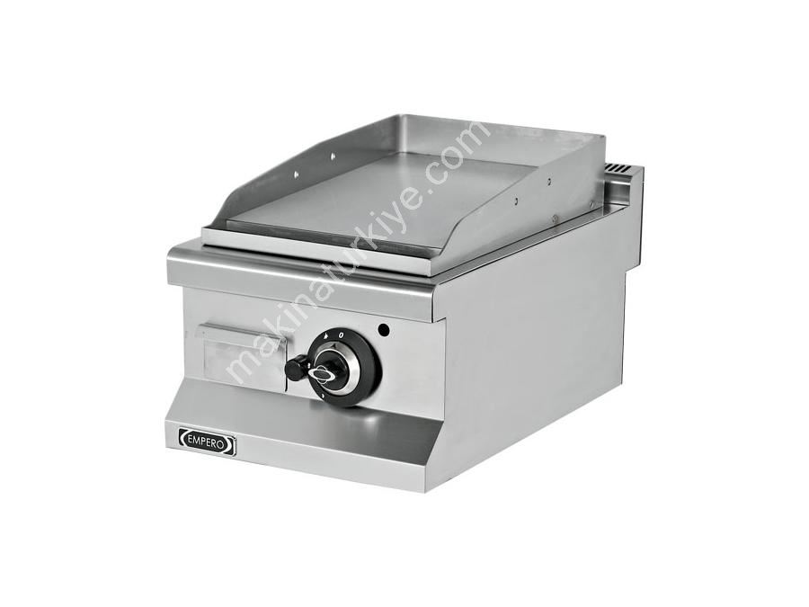 Flat Chrome Plate Electric Grill The Empero EMP.6IE010 Flat Plate Electric Grill is a compact and powerful cooking solution that provides high performance and efficiency in commercial kitchens. With dimensions of 400x635x285 mm and a weight of 45 kg, this device is designed for heavy kitchen use and made from durable materials. With a power of 3.6 kW, it allows you to cook your meals quickly and efficiently by providing effective heating. Thermostatic control allows you to precisely adjust the temperature level of the device, ensuring that meals are always cooked perfectly. Two-zone heating in full modules allows for the simultaneous cooking of different dishes, making kitchen operations more efficient. This feature is ideal for quick and flexible cooking processes in professional kitchens such as restaurants and hotels. The removable grease collection tray allows for easy collection of grease generated during cooking, greatly facilitating cleaning processes. The easy-to-clean and hygienic design allows for extremely quick and effective maintenance of the device, ensuring a hygienic environment during heavy kitchen use. The top plate thickness is 1.2 mm, and the body is made of 1 mm stainless steel, ensuring the device's longevity and providing durable use. The limit thermostat prevents overheating, ensuring the device operates safely and increases energy efficiency. The EMP.6IE010, compatible with 400V AC 3N PE electrical input, offers a safe and efficient electrical connection with a cable cross-section of 5x2.5 mm². As a result, the EMP.6IE010 Flat Plate Electric Grill is an excellent choice for commercial kitchens, providing high efficiency, safe use, and easy cleaning. It makes kitchen operations more efficient by saving both time and energy.