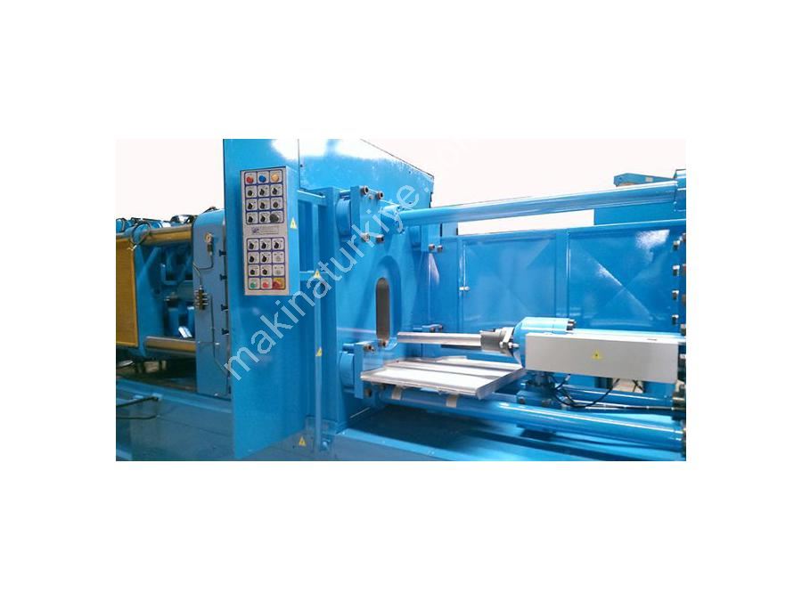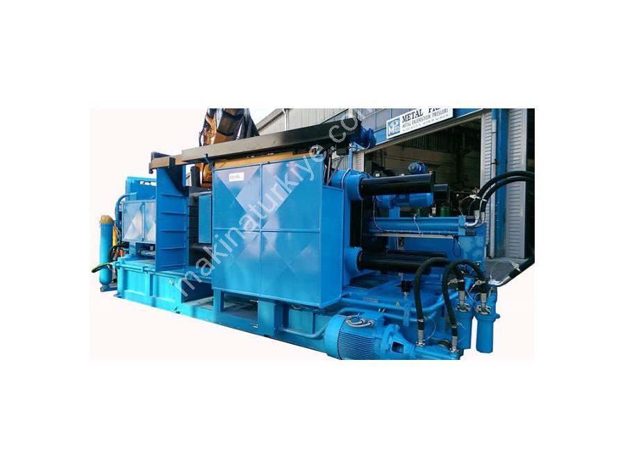 Сила закрытия: 5700 кН Максимальное движение подвижной плиты: 750 мм Высота формы (мин./макс.): 300 – 900 мм Размеры плиты: 1170 × 1150 мм Расстояние между колоннами: 710 × 710 мм Диаметр колонны: 150 мм Сила толкателя: 280 кН Ход толкателя: 180 мм Сила инжекции: 600 кН Ход инжекции: 550 мм Диаметры камеры (мин./макс.): 60 – 120 мм Максимальный вес детали (алюминий): 7200 г Максимальная площадь литья: 1000 см² Мощность двигателя: 30 кВт Вес машины: 24000 кг Размеры машины (Д × Ш × В): 8000 × 2400 × 3100 мм PLC или микропроцессорная электронная система управления Графический контроль с переменными скоростью, давлением и расстоянием (контроль выстрела – кривая инжекции) Возможность поддерживать максимальное качество производства с контролем 11 различных параметров Гидравлическая система с пропорциональным управлением (Vickers – Parker) Возможность записи референсной кривой для 500 различных форм Система отчетности об ошибках Система защиты с замком давления крышки Система охлаждения масла с пластинчатым теплообменником (Alfa–Laval) Пластинчатый теплообменник для масла (Alfa–Laval) Система смазки точек пропорционального управления Стальные литейные пластины и группа ножниц Контролируемая сила зажима формы Система открытия цикла зажима группы ножниц Системы безопасности группы ножниц с пропорциональными устройствами Система звукового и визуального предупреждения Цифровой индикатор уровня масла Цифровая система контроля температуры масла Электронный гидравлический термостат Соответствие CE и сертификат Подготовка для электронной связи (I/O) Смазка поршня Робот для линейной/ротационной захватки Робот для смазки формы Робот для получения деталей (приемка материалов)Металлический пресс MP-550 Металлический инжекционный пресс